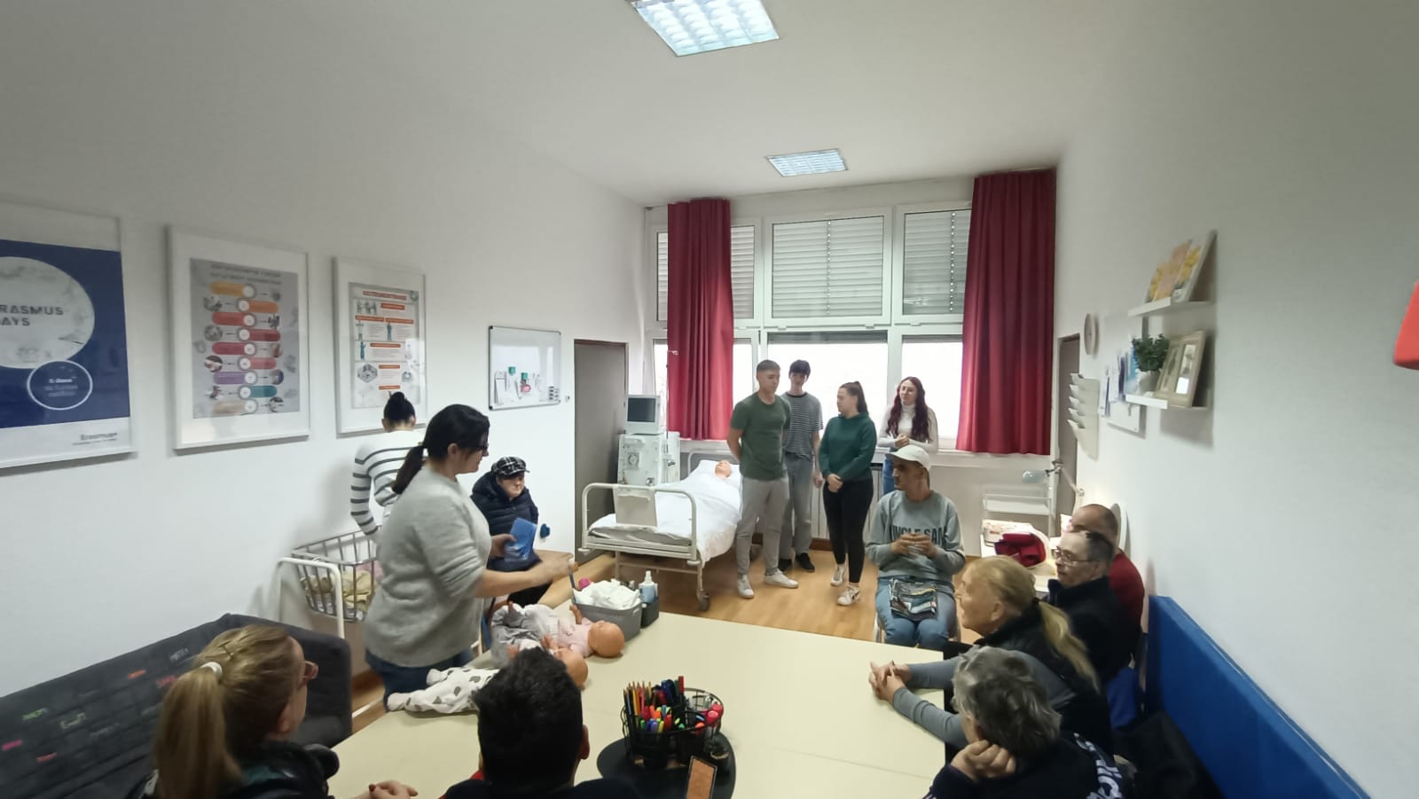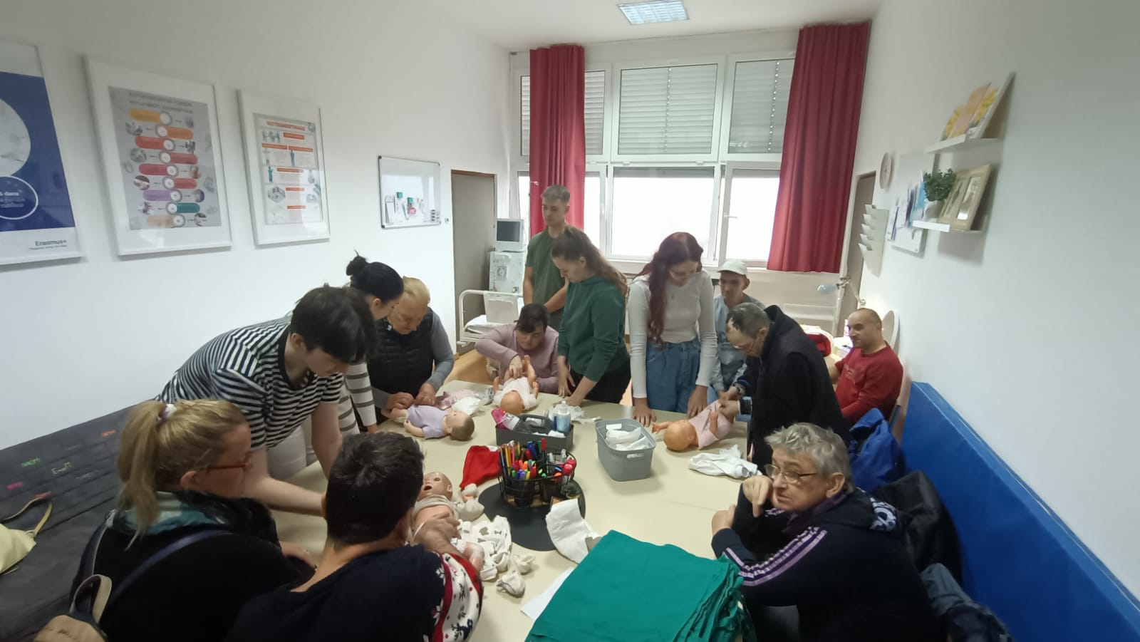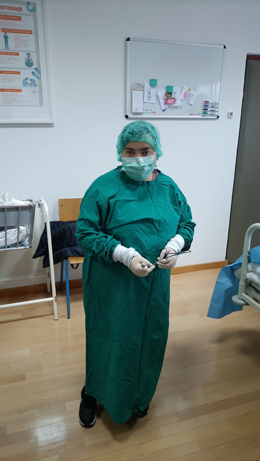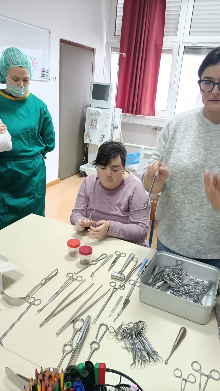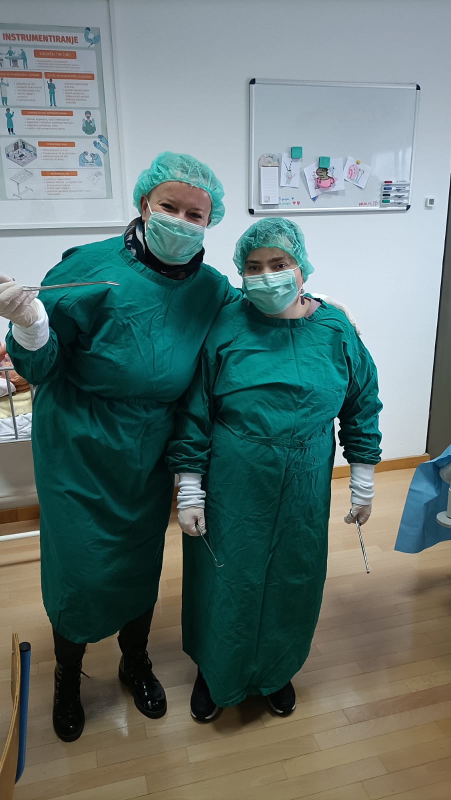 Nakon obilaska škole uputili smo se u kabinet gdje su nam učenici pokazali postupak spašavanja i pružanja prve pomoći kod gušenja. Također smo naučili kako se premotavaju novorođene bebe. A na kraju su nam dali da se obučemo u opremu koju oblače medicinske sestre i kirurzi u operacijskoj sali. U tom trenu i mi smo postali dio ekipe kirurškog tima. Obuki smo, kirurška odijela, kirurške kape, maske i kirurške rukavice i krenuli u spašavanje našeg pacijeta.